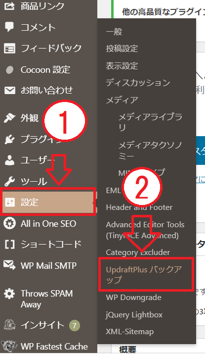 WordPressの管理画面から、①「設定」→②「UpdraftPlus バックアップ」をクリックします。