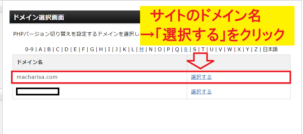「ドメイン選択画面」で、サイトのドメイン名の右側「選択する」リンクをクリックします。